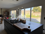 Elle se compose de plain-pied, d'une entrée, d'un toilette, d'un cellier et d'une spacieuse pièce de vie avec cuisine aménagée et équipée sur salon avec poêle à granules. De grandes baies vitrées donnent sur les terrasses et le jardin clos de murs sans vis-à-vis.
