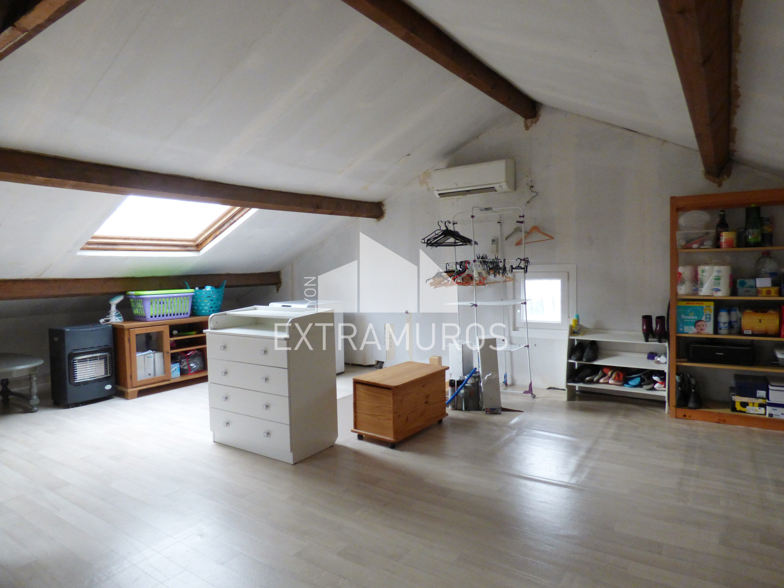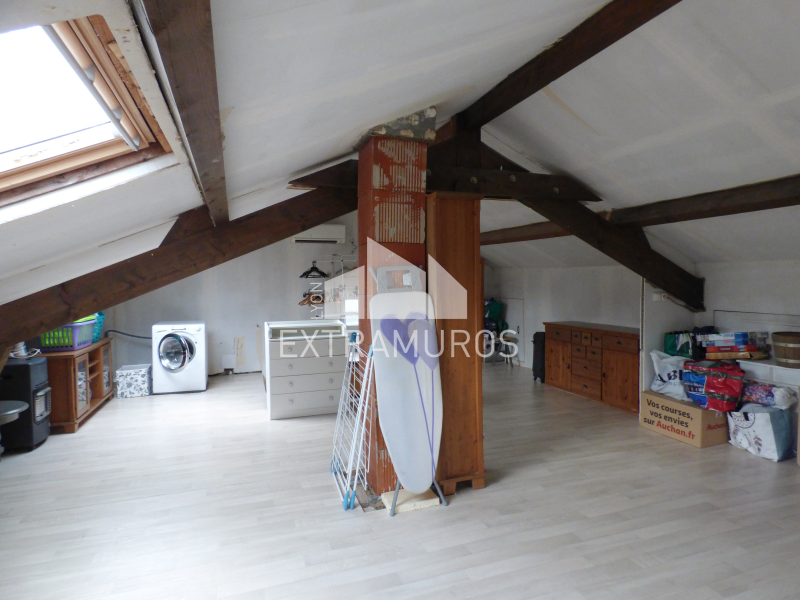 A l'étage vous disposez d'une grande pièce de 47 m² au sol pouvant être aménagée. Cette pièce est actuellement isolée, chauffée et dispose de deux fenêtres et de deux velux, il ne manque plus que votre imagination pour créer les pièces souhaitées.
