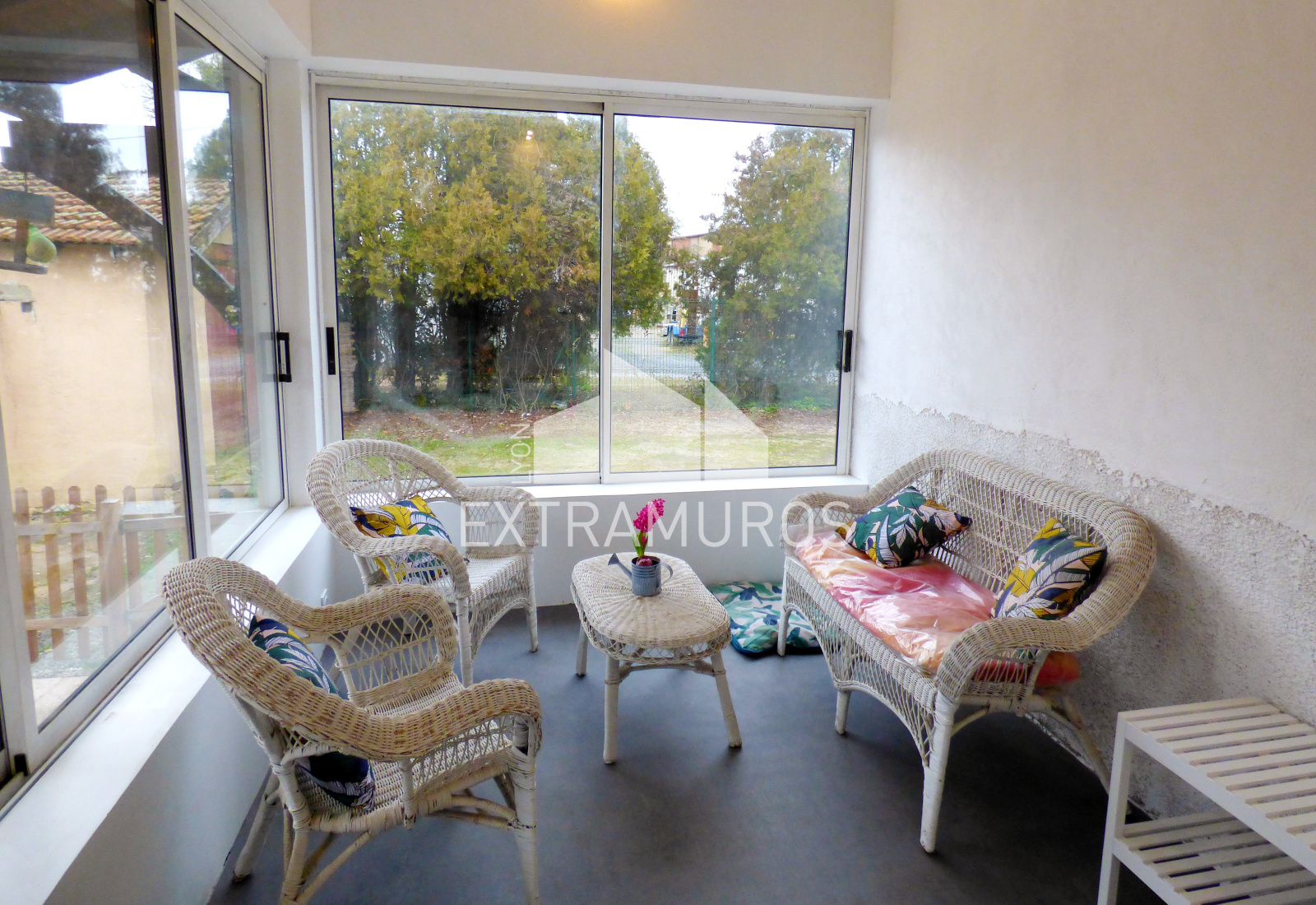 Terrain de 810 m² clos et arboré, terrasse de 100 m² exposée SUD, cour avec de nombreux stationnements possibles.