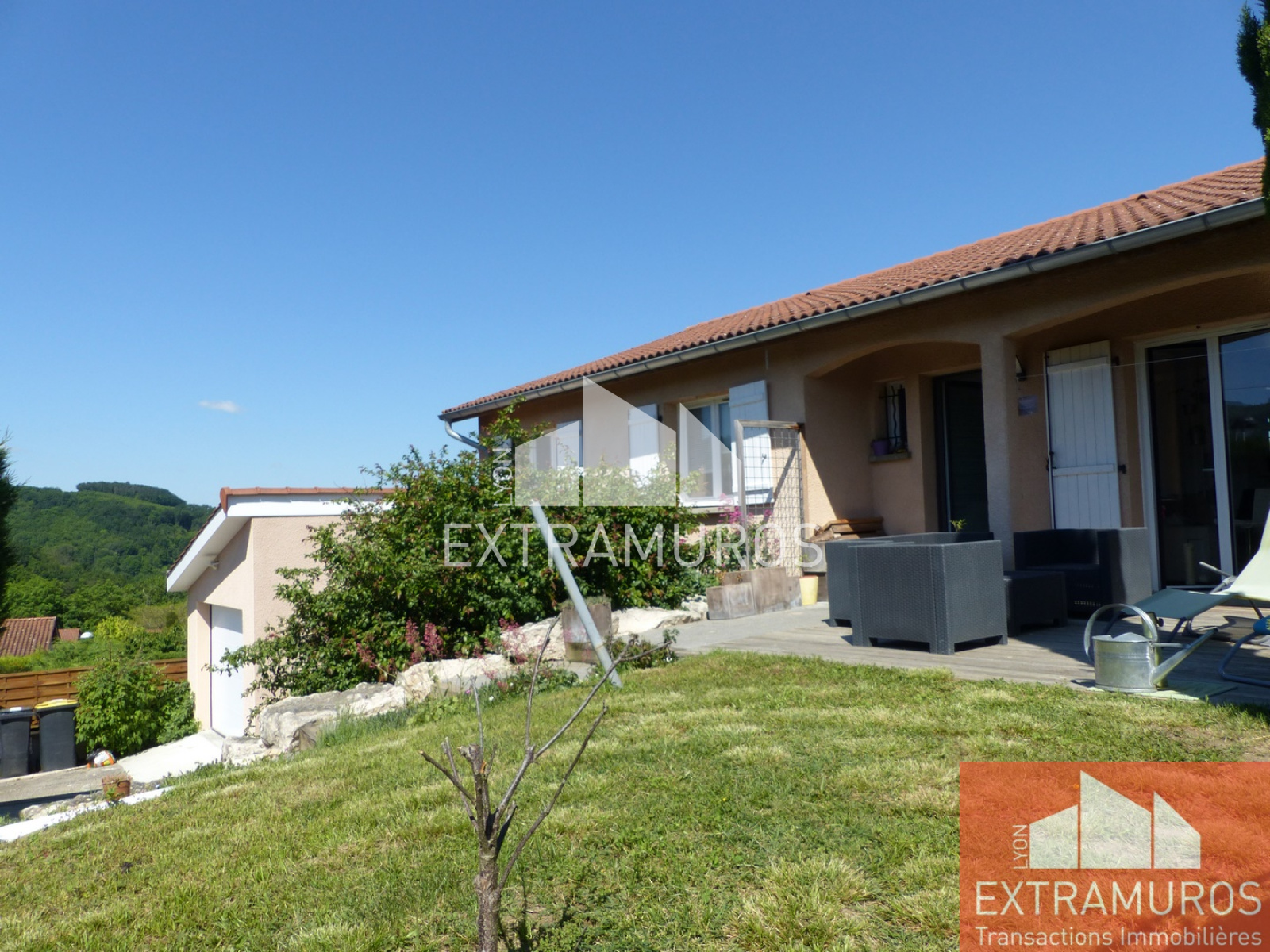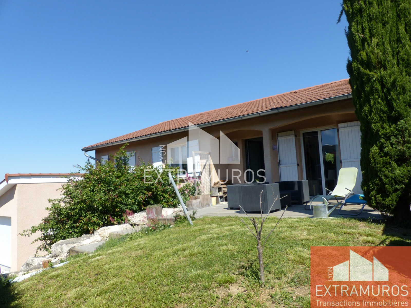 LYON EXTRAMUROS vous propose en exclusivité, au Fonds d'une impasse Agréable Maison de 120 m² Construite en 2001, L'habitation se compose de plain-pied d'une grande pièce de vie de 45 m² avec cuisine aménagée ouverte sur le salon. Pièce traversante qui donne sur deux terrasses. Coté nuit 4 chambres et salle de bains refaite récemment. Au demi-sous-sol on retrouve une pièce aménagée pour un mini studio ou 5 ème Chambre donnant sur une terrasse privative, Salle d'eau avec toilettes et rangements. Coin atelier et buanderie. Garage de 25 m² et un second garage de 40 m² complète les annexes. Terrain Clos de 501 m². Très Bon état général. Chauffage individuel Gaz de viile. Toutes les commodités à pieds du centre de Saint Pierre la Palud: Commerces, Crèches et Ecoles Primaires. 5 Minutes en voiture pour la gare de Sain Bel avec le Tram-Train et 7 KM de L'entrée de l'Autoroute A 89 à L'Arbresle.